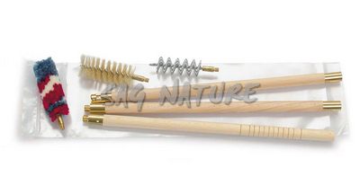 1301144 - KIT PULIZIA FUCILE IN BUSTA PLASTICA C/BACCHET. LEGNO VERNIC SCURO A 3 PZ TIPO INGL. SCOV. PURA LANA GREZZA , SETOLA, BRONZO SPAZ. C/FILETTAT. INGLESE